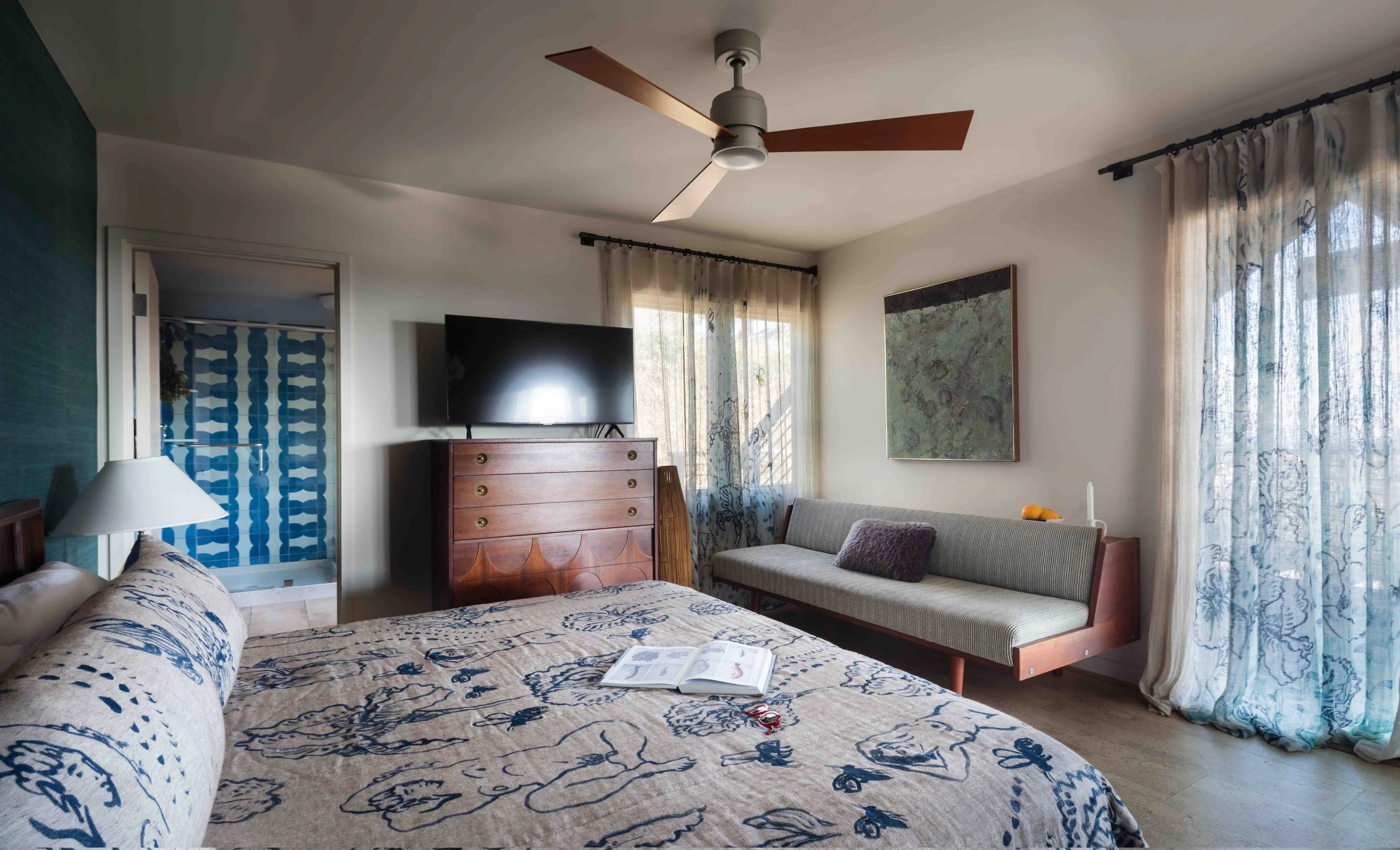 It was an absolute joy to create textiles for the “Blue Room” at a stunning midcentury modern home by Ike Baker Velten in San Diego, CA. I created a series of monotypes which I then screenprinted on beautiful open weave and gauze linens for a coverlet and sheer curtains.