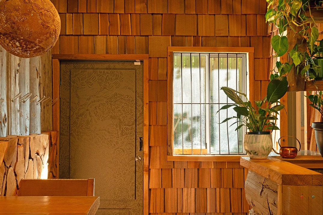 I was invited to paint the salon and bathroom areas of Pale Fire in 2024. The painted embellishments in the salon area quietly add to the layers of the hand made environment that gallerist Amy Kazymerchyk has beautifully curated, while the vermillion landscape in the bathroom is a vibrant exploration of brushstrokes and movement. After completing the paintings I screenprinted the shower curtain and window covering with monotypes of dancing nudes and animals.