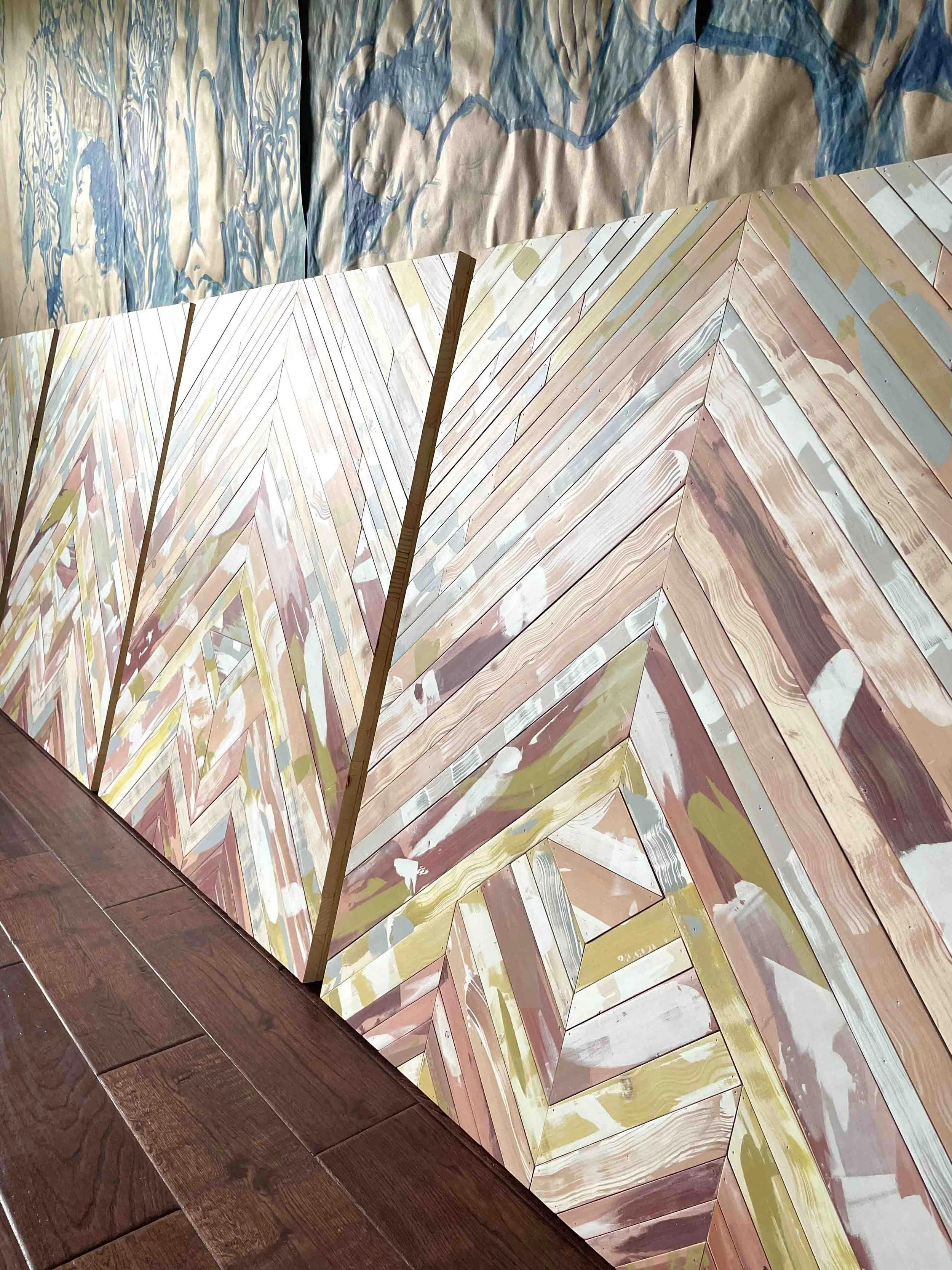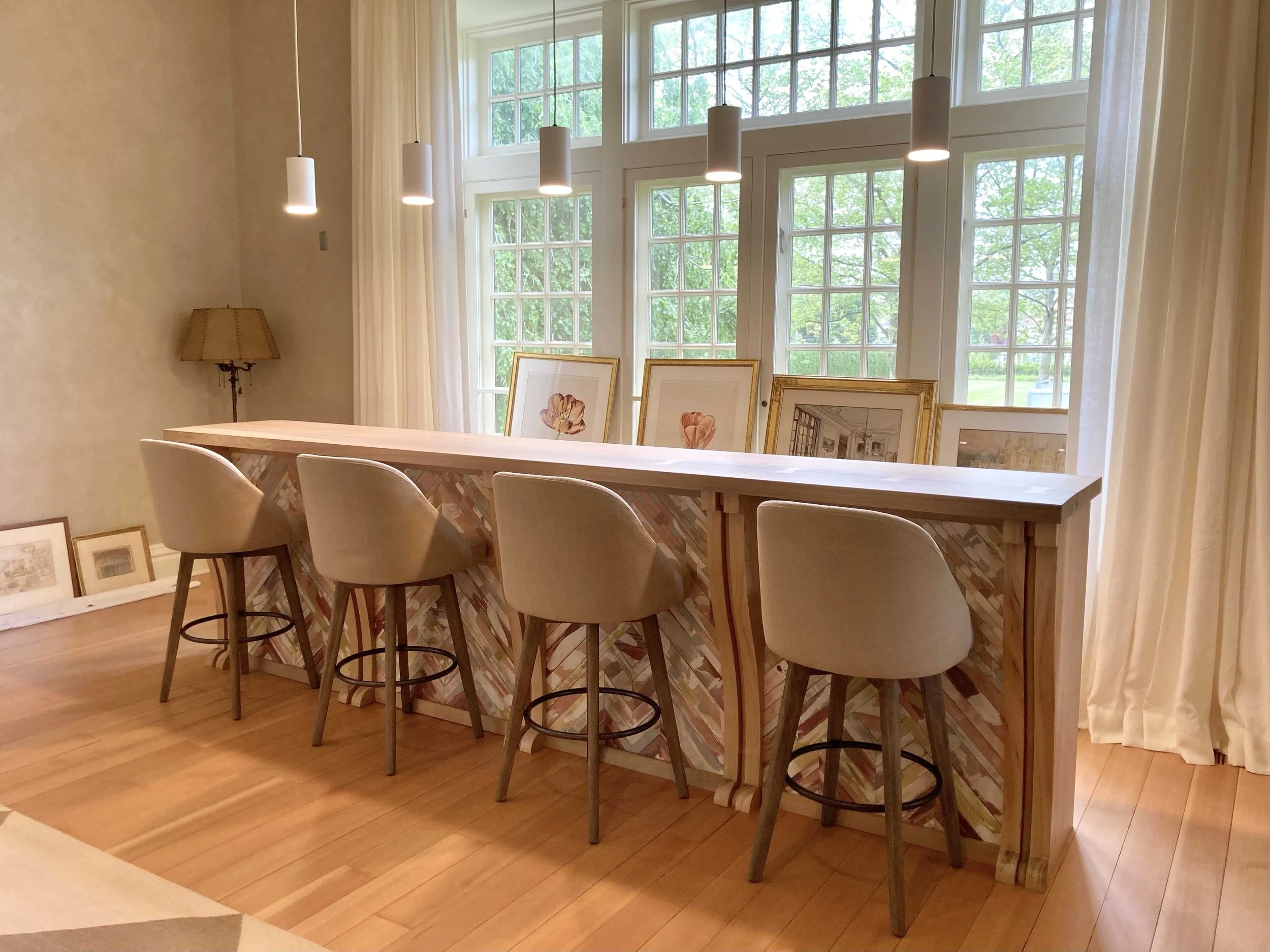 This custom parquet bar front was created for an Arts and Crafts residence in New Jersey. Each wood panel is developed through layered screenprinting and hand-painted linework, creating depth, texture, and variation while maintaining a cohesive, repeating pattern across the full surface of the bar.