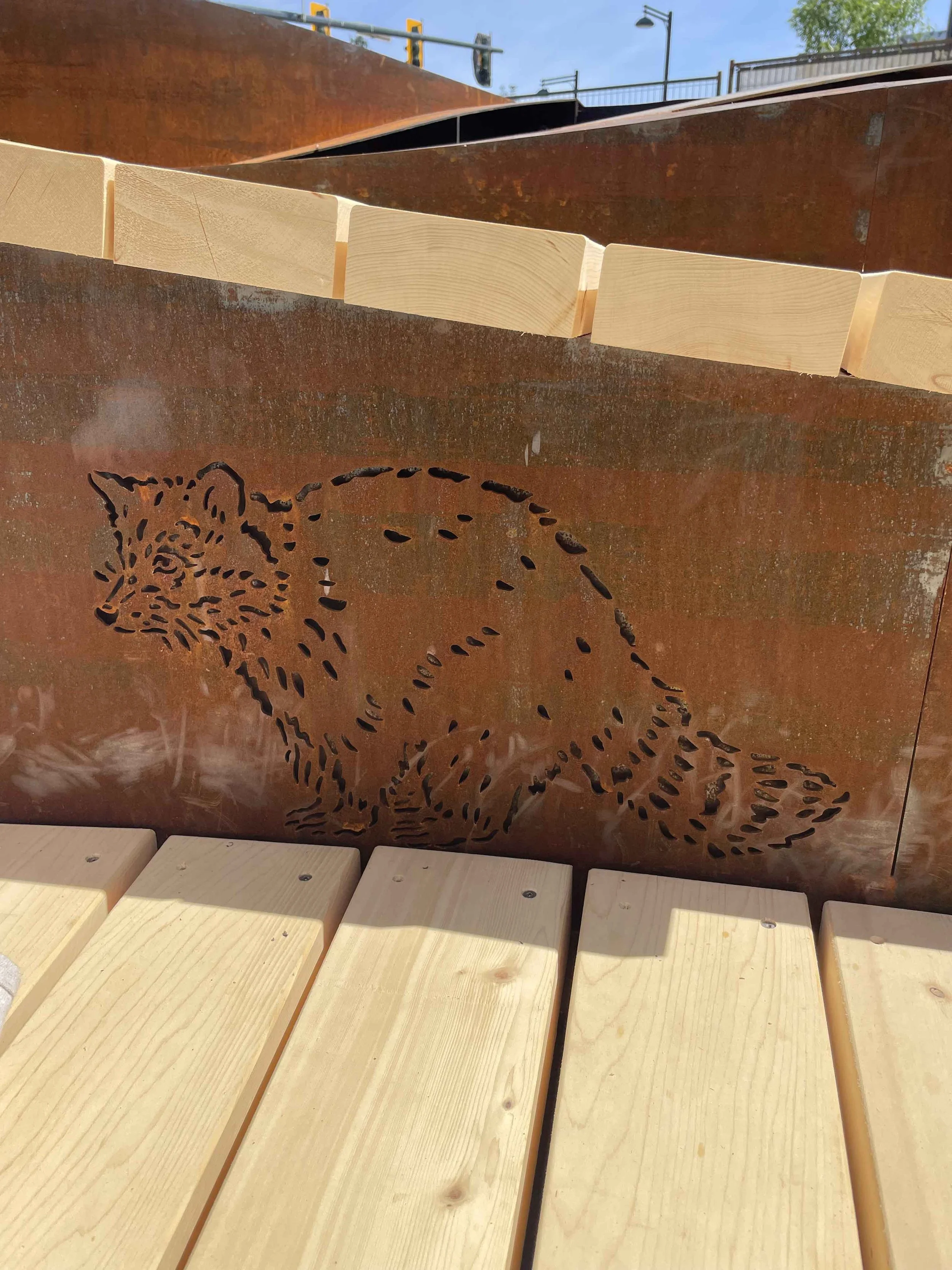 Corten steel, yellow cedar