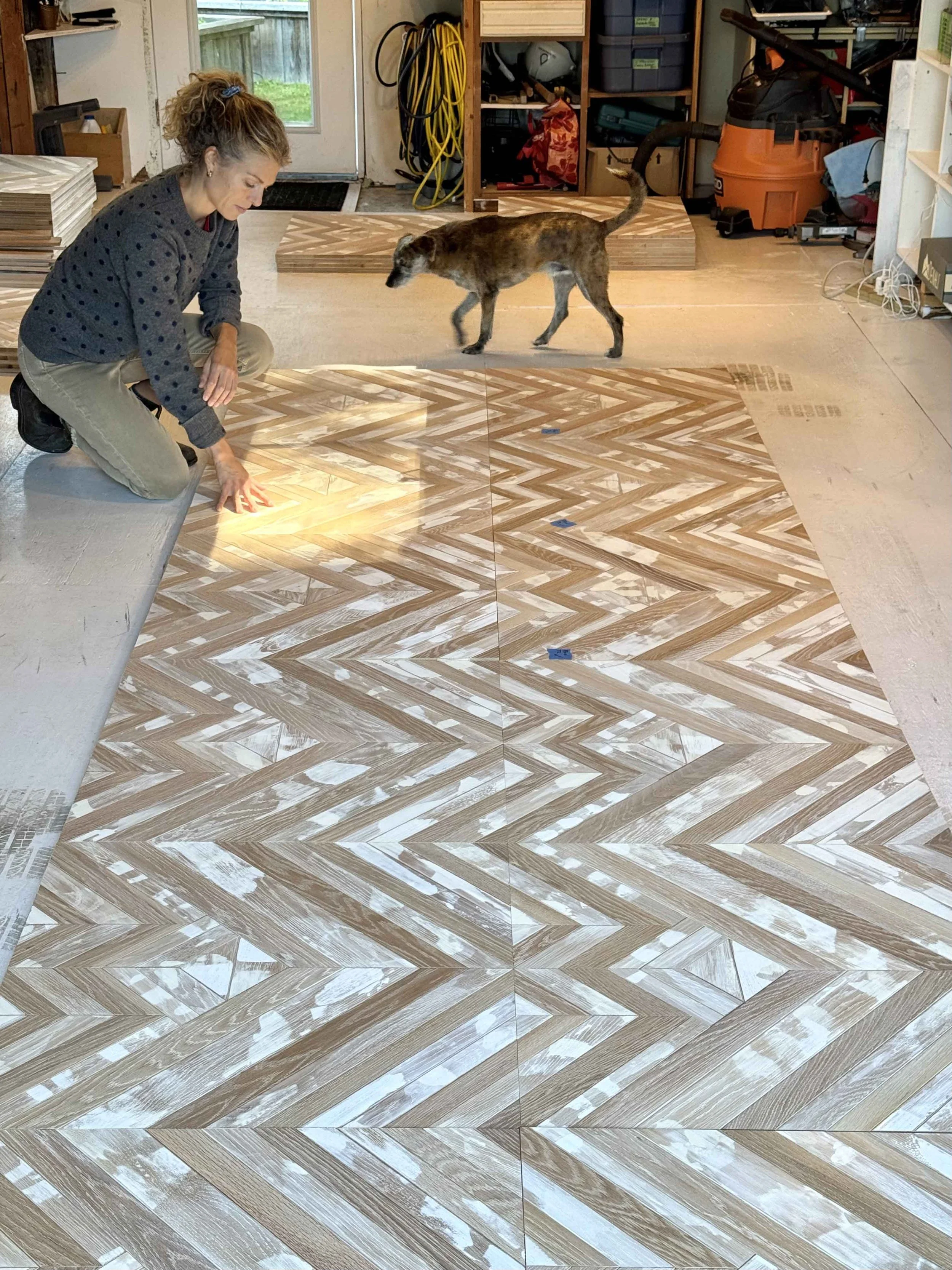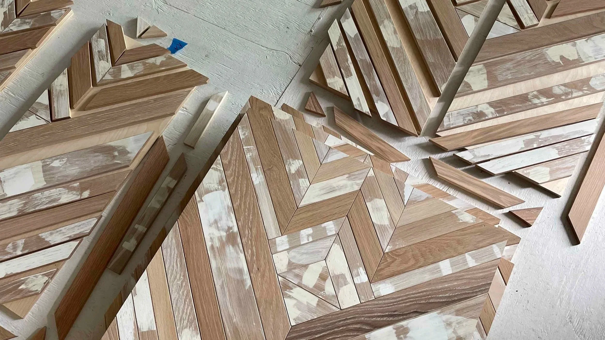 This series of custom hand-painted and screenprinted parquet panels was created for a pool house at a private residence by Kligerman Architecture & Design on the Hudson River in New York. While the overall composition forms a continuous repeating pattern across the surface, each individual panel remains distinct— through its own unique screenprinted layers, paint markings, and natural wood grain.